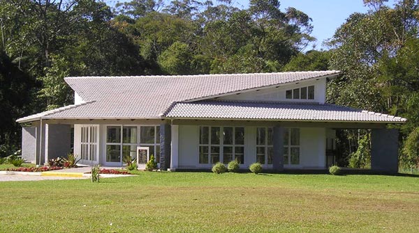 pedra e telhas de concreto. O desenho da cobertura, elevando